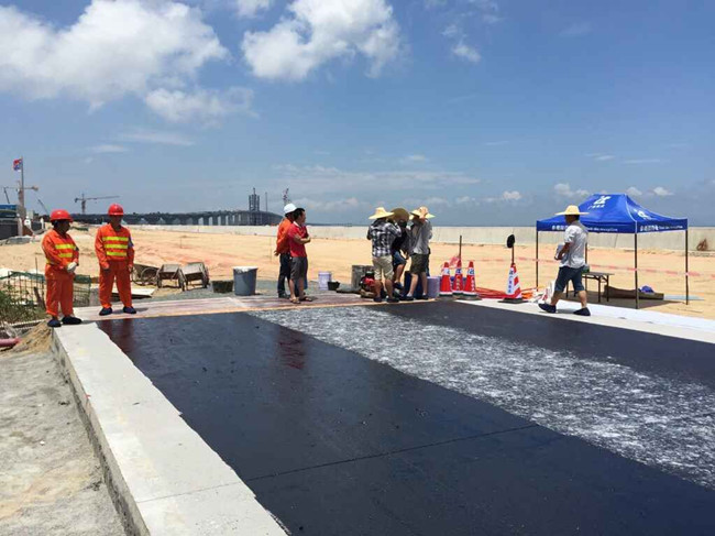 该试验段位于人工岛项目部大门右侧30m,采取了抛丸打砂+溶剂型防水粘接剂+加劲纤维+GA10的铺装方案,为确保试验段施工顺利进行,公司副总文海亲临施工现场进行指导。经过与项目部共同努力,在5月15日顺利完成该项目试验段施工。