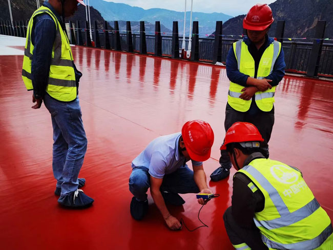绿汁江特大桥桥面铺装采用了“钢桥面基层抛丸除锈+甲基丙烯酸树脂防水体系+3.5cm厚GA-10浇筑式沥青砼下面层+3.5cm厚沥青玛蹄脂碎石上面层”的铺装技术。为确保高质量完成绿汁江特大桥钢桥面浇筑式铺装任务,项目从施工方案的编制、施工人员的技术培训、安全质量技术交底、原材料试验检测等层层严格审核和把关,责任到人,做到方案不具体、准备不充分不施工。且在钢桥面浇筑式铺装前,我司顺利完成了喷砂除锈、底涂层、防水层等工序的施工。