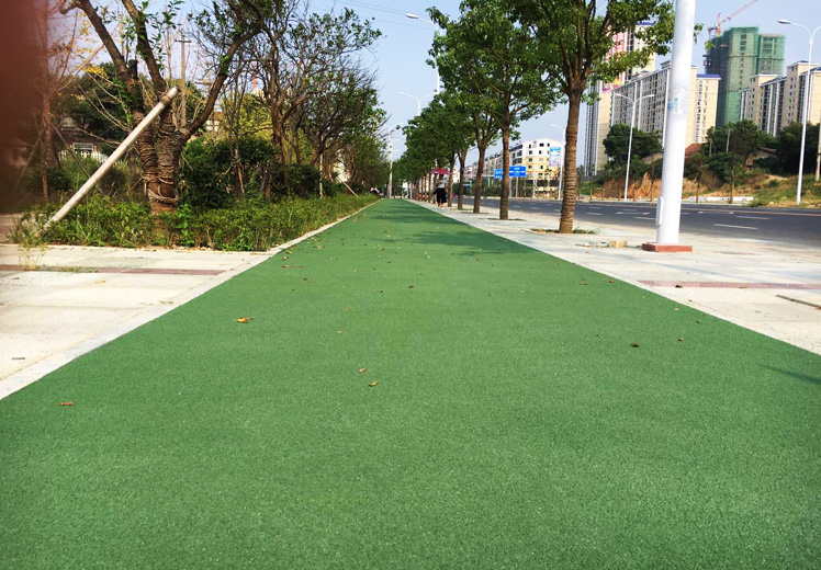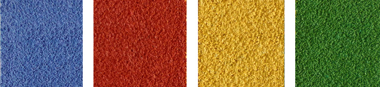 彩色柔性环氧抗滑表层,是在沥青(水泥砼)路面上用改性环氧树脂粘结彩色陶瓷颗粒而形成的5-7mm 厚度的薄层彩色路面,是一种具有高磨擦和高防滑性能的薄层彩色路面结构,系美国技术。其丰富的色彩更利于交通引导,能够提高司机注意力。彩色防滑路面可有效增强车辆减速效果及大大缩 短车辆的刹车距离,并具有降低侧滑机率和提醒减速的作用,是一种有效预防和降低交通事故的重要技术手段。可以提供蓝、红、黄、绿、等颜色选择,见下图。