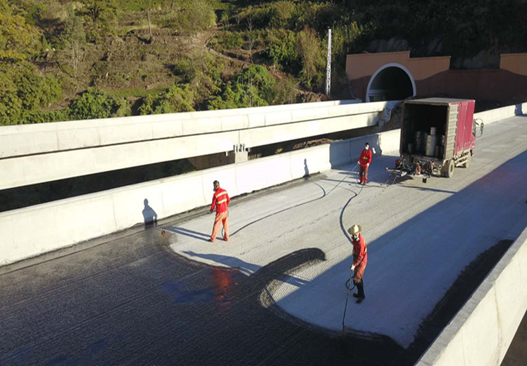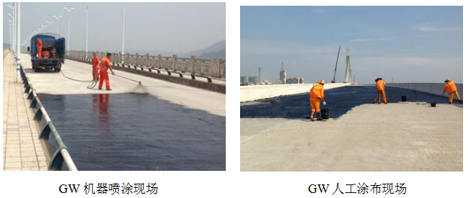②机器喷涂:由操作人员手持喷枪,将喷枪后部的弯管直接从原料桶中吸取GW防水涂料,喷枪口喷出雾 状的GW,均匀覆盖在桥面。在第一遍喷涂干燥后进行第二遍喷涂。待GW涂膜完全干燥后,即可进行沥青混合料的摊铺。