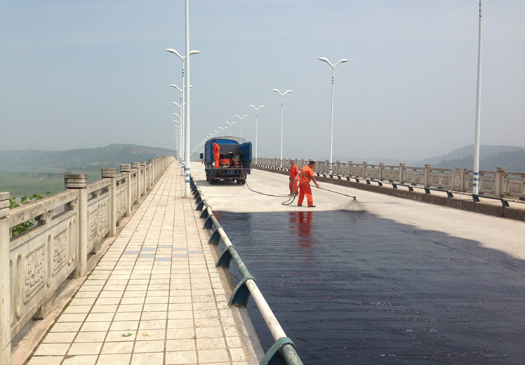 ②机器喷涂(无空气喷涂机):由操作人员手持喷枪,将喷枪后部的弯管插入原料桶中,直接从原料桶中吸取粘结剂,喷枪口喷出雾状的粘结剂,均匀覆盖在桥面。在第一遍喷涂1小时之后进行第二遍喷涂。待GU涂膜完全干燥后,即可进行沥青混合料的摊铺。