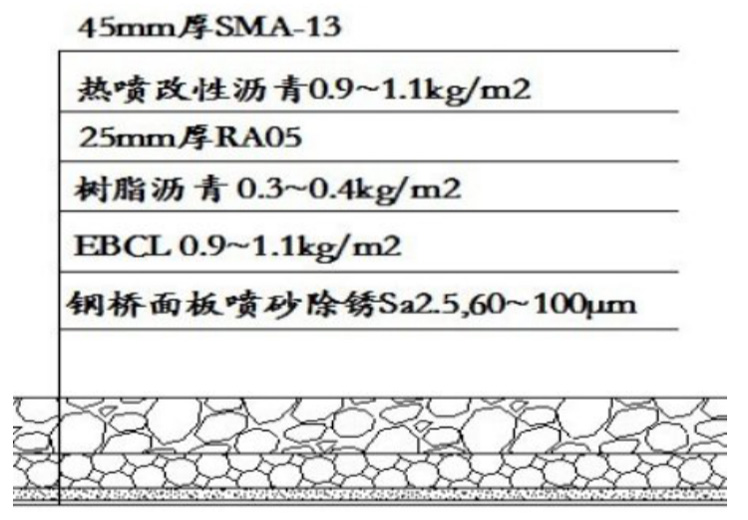 ERS 组合式铺装,其结构是 EBCL 环氧碎石防水抗滑层+3.0cmRA05 冷拌树脂沥青混凝土+4.5cm高弹改性沥青混凝土(简称 ERS,具体结构如图所示。)